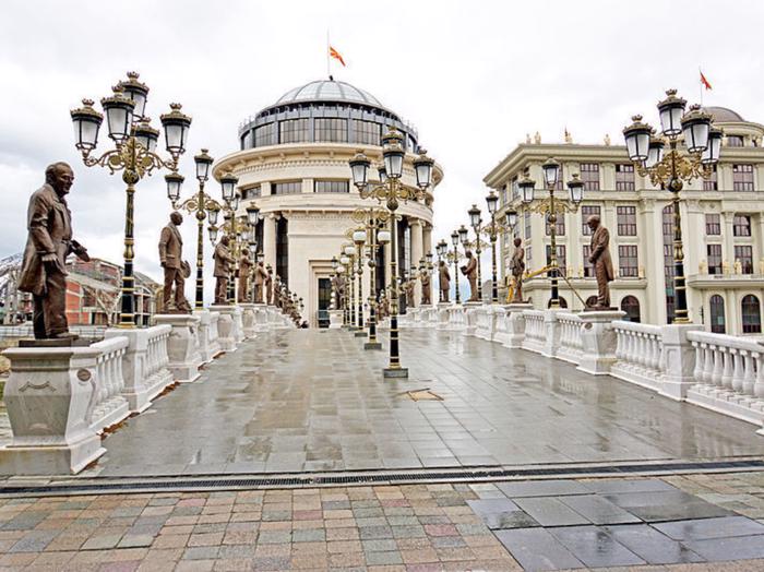 The National Theatre of Republic of macedonia is located perfectly on the banks of the Vardar and then information technology is bully for river views besides as enjoying the best of Macedonian ballet and opera. The beautiful white edifice was recently refurbished every bit part of a wider government programme to improve the wait of Skopje'south